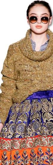![]() ![]() ![]() This is "mismatch extremism". Prints, colors and offbeat silhouettes, old and new combined to showcase an eclectic montage of well..fun! This collection is amusing, vibrant, exotic and sentimental. I luv the long fur-lined vest with colorful tassels and I am definitely gonna start tucking all but one part of my shirt into my skirts and high waisted pants - it's those little details! Great show...I'm inspired! Photos: Gianna Pucci / Indigitalimages.com