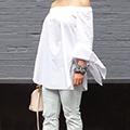 Tibi off-the shoulder tunic, 7 For All Mankind 1984 boyfriend jeans, Manolo Blahnik pumps, LV handbag, Brandi Melville bandana bracelet (Wired bandana hair