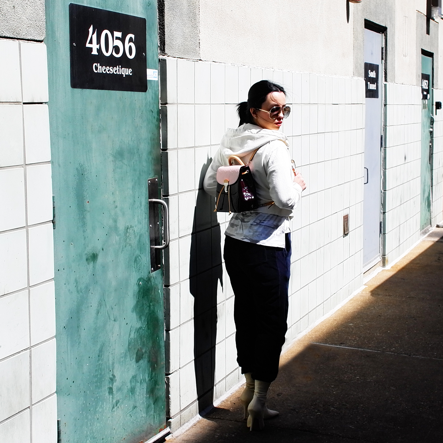 Chloé sunglasses, Sincerely Jules hoodie, Sanctuary camo tee, Kendall + Kylie velour jogger, Yeezy Season 6 ankle boots, Louis Vuitton Hot Springs backpack
