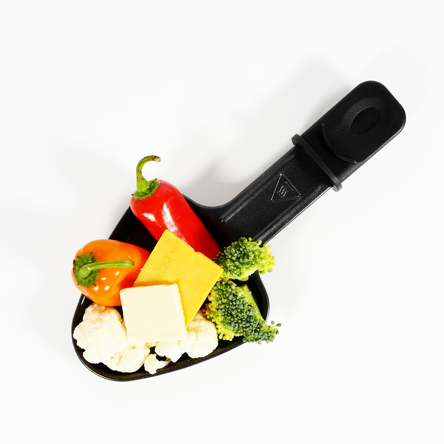 There are six raclette pans that fit nicely under the heating element. I suggest putting a few veggies and topping with cheese and Jalapeños or hot peppers (to taste). Don't overflow the pan, cause it won't fit under the element - so make sure to cut the veggies into small pieces. I also like to serve a bowl of purple corn tortilla chips. Once the cheese is melted, you can pour the veggies and cheese onto the chip - DELICIOUS! You can also pour a little hot salsa over the veggies and cheese. My favorite cheeses for raclette are Boar's Head Canadian Cheddar, Boar's Head Sharp Cheddar and a horseradish infused cheese. Most grocery stores also stock raclette cheese, but it's a little strong for me. DO NOT purchase one of those trays with perfectly squared cheese slices - it's processed and doesn't melt properly. Splurge and get the good stuff.