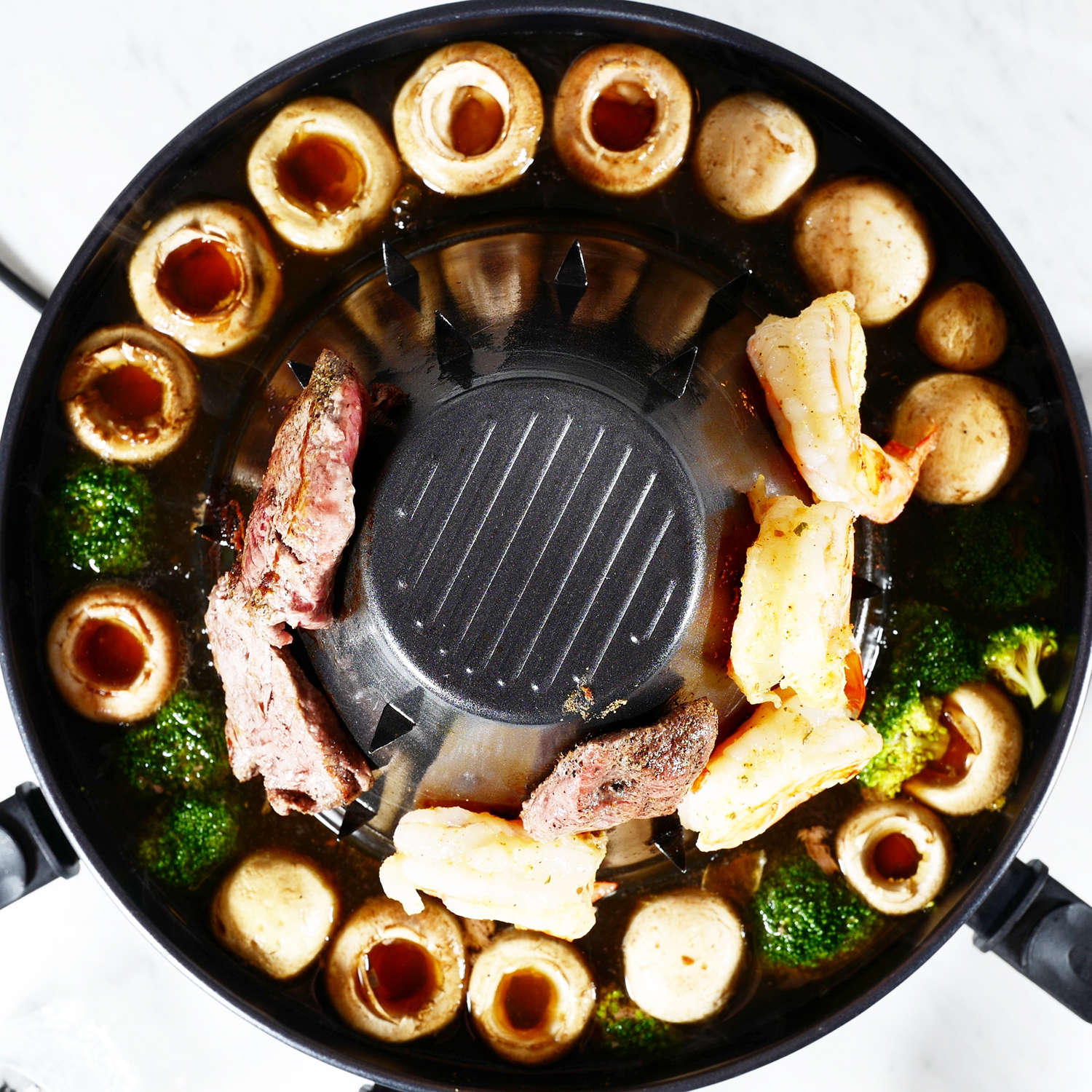 Put a little cooking spray on the cone, so the meat doesn't stick, turn your grill on high and pour the broth into the shallow rim. Place all your prepared veggies, cheese and proteins on the table and let the grilling and dipping begin. I suggest getting the proteins on the cone immediately, so the cooking spray doesn't burn. I like to use fondue plates, cause they're sectioned and the sauces and juices don't run all over the plate. You can also place small containers for the sauces. Cooking times are as follows.. Once the cheese has melted over the veggies, dig in. The veggies should be el dente. Broccoli and mushrooms - 3+ min, filet - depends on preference and shrimp 3+ min (depending on size). If you are grilling chicken, I'd give it 4+ min (depending on size).