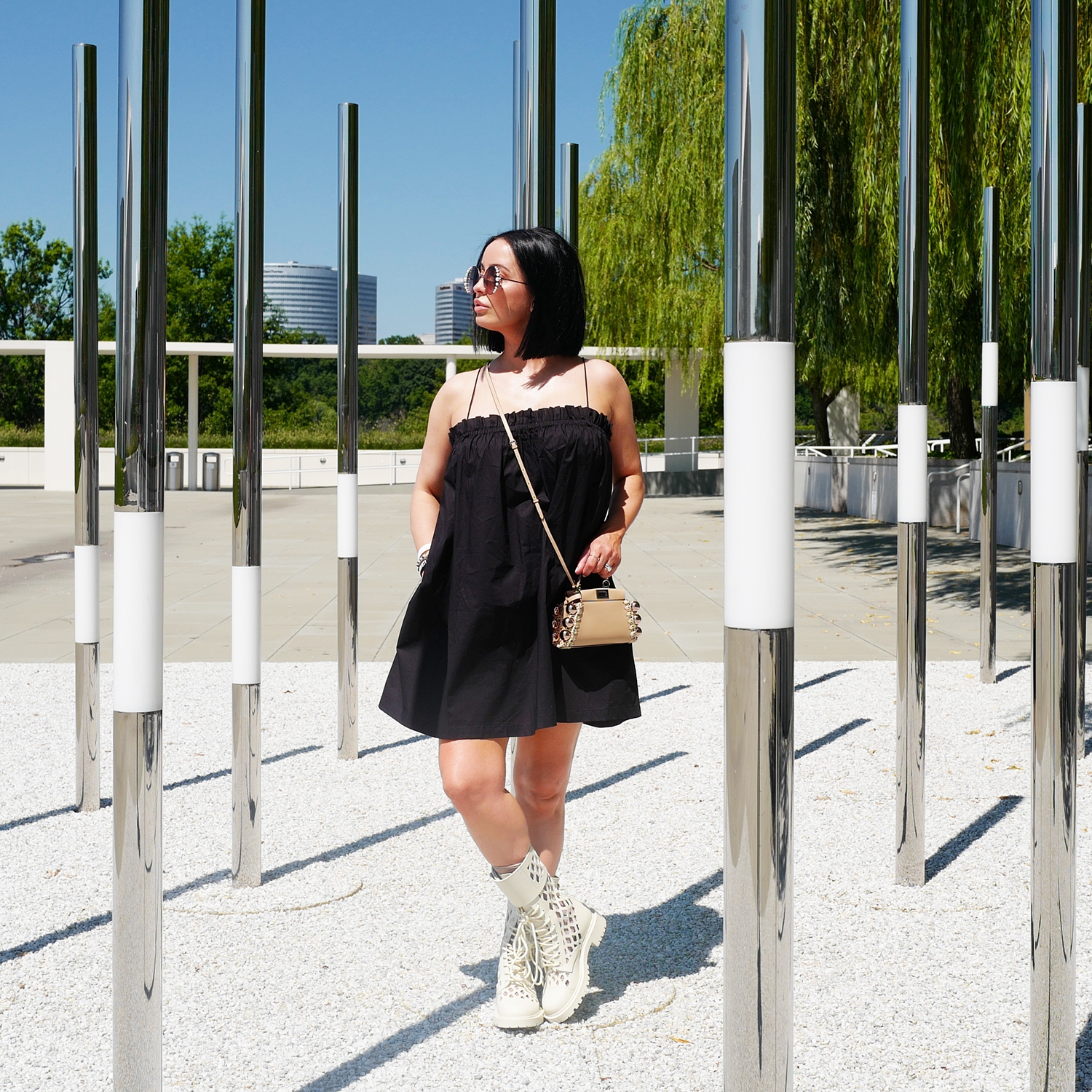 Fendi pearl embellished sunglasses, L'Academie Arcello mini dress, Fendi mini peekaboo, Dior J'adior cotton oblique bracelet set, Dior D-Trap ankle boots