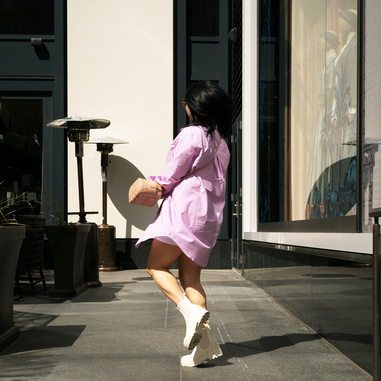 Dior UltraDior Su Nude Square sunglasses, Camila Coelho Elliot Shirt Dress in Pink Lilac, Joah Brown fitted sweat shorts, Dior Rose Des Vents carnage Lambskin Vanity Case, DiorIron ankle boot